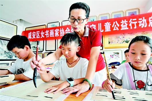 湖北日報訊 今年暑假,咸寧留守兒童有了新去處,該市一批書道精湛、和藹可親的女書法家免費教他們學習書法。咸寧市咸安區(qū)女書畫家協(xié)會去年成立,一直堅持周末及寒暑假設立兩處書法授課點,對周邊留守兒童免費開放。(記者劉曙松 視界網(wǎng)李旻媛 攝)