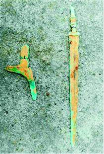 他上前一看,竟是一把青銅劍和青銅戈。他們現(xiàn)場(chǎng)測(cè)量了一下,劍長(zhǎng)約60厘米,重約400克;戈長(zhǎng)約15厘米,重只有約200克?!罢媸俏奈?!”杜正祥立即通知了向家村委會(huì)和四莊鄉(xiāng)政府。