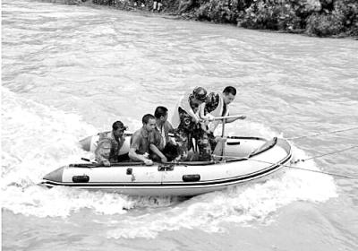 消防官兵立即用拋投器將繩索投至河對岸,隨后,一名消防員身穿救生衣,采取大繩橫渡的方式,涉水到達(dá)對岸,并將繩索固定好。稍后,消防官兵借助水面橫行艇與繩索,一趟又一趟地橫渡該河,將全部被困人員接回安全地帶。