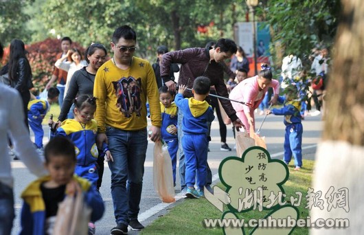 出發(fā)后,父母帶領(lǐng)著孩子們?cè)谑豆珗@進(jìn)行3公里徒步,途中看到垃圾就夾起來(lái)放進(jìn)垃圾袋里。幼兒園的老師們領(lǐng)著孩子們唱《大王叫我來(lái)巡山》《哇哈哈》歌兒,還喊起活動(dòng)口號(hào),歡樂(lè)不斷。