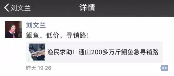 和丁小強(qiáng)一樣,中百超市副總經(jīng)理劉文蘭,也在朋友圈轉(zhuǎn)發(fā)了湖北日?qǐng)?bào)的微信稿件,并配文:“鮰魚、低價(jià)、求銷路”,幫忙推廣。