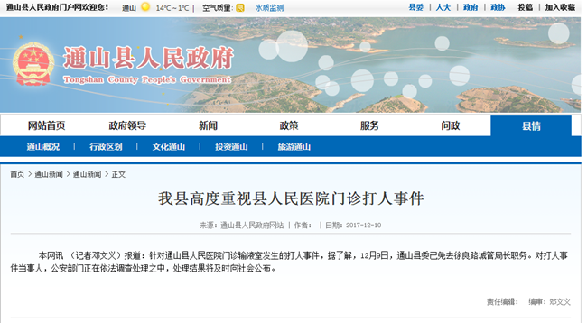 針對通山縣人民醫(yī)院門診輸液室發(fā)生的打人事件,據(jù)了解,12月9日,通山縣委已免去徐 良路城管局長職務(wù)。對打人事件當(dāng)事人,公安部門正在依法調(diào)查處理之中,處理結(jié)果將及時(shí)向社會(huì)公布。