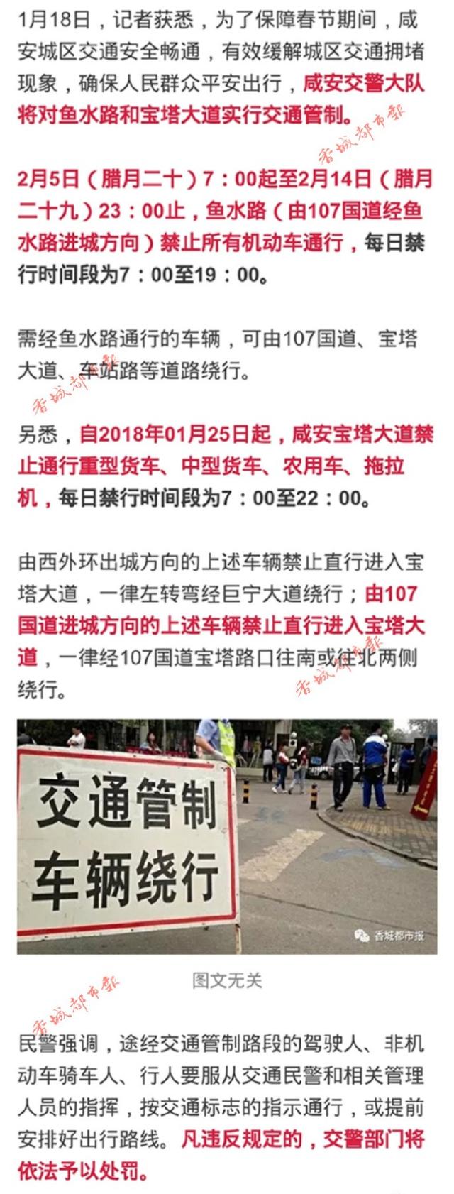 18日悉,為保障春節(jié)期間,咸安城區(qū)交通安全暢通,咸安交警大隊將對魚水路和寶塔大道實行交通管制。途經(jīng)交通管制路段的駕駛?cè)恕⑿腥艘慕煌窬拖嚓P(guān)管理人員的指揮,按交通標(biāo)志的指示通行。凡違反規(guī)定的,將依法處罰。具體路段