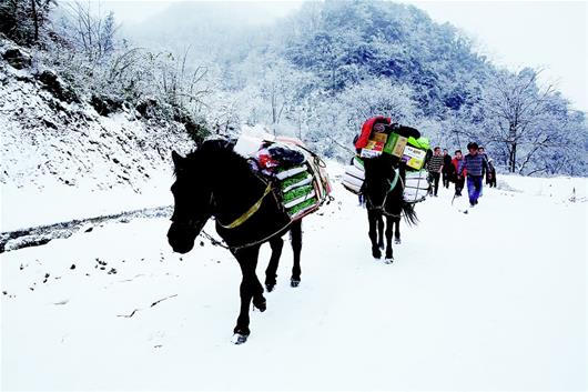 楚天都市報訊(記者周鵬通訊員汪淑琴陳振清)大雪壓彎了楠竹,封鎖了下山的路,可是攔不住大家的愛心。昨日上午8時許,崇陽縣銅鐘鄉(xiāng)接到求助電話,該鄉(xiāng)大嶺村1組十多戶20余名村民被困山上,生活物資即將耗盡。鄉(xiāng)黨委書記杜兵立即啟動應(yīng)急預(yù)案,并請馬幫運送物資上山(如圖)。