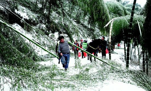 中午12時30分許,救援隊一行30余人出發(fā)。上山的路雖然是公路,但積雪很厚,最深處10余厘米,加上結(jié)冰,可謂步步艱難。一路上,被大雪壓斷的楠竹不時阻斷道路,救援隊專門請來三名村民,提前砍竹清障。大家跟著馬幫師傅,小心翼翼通過危險路段。