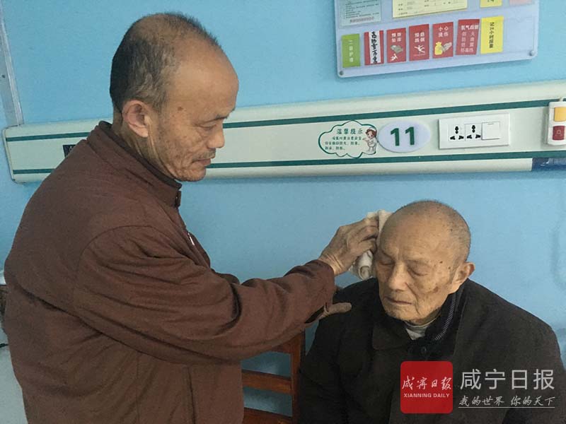 在咸寧市中醫(yī)醫(yī)院老年病科的走廊,常常會見到一位身材清瘦的老人推著輪椅,輪椅上坐著一位頭發(fā)花白的老者。老人時而給老者蓋好搭在腿上的薄被,時而給他擦擦嘴角的口水,時而給他講講有趣的事情……