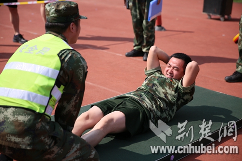 圖為消防官兵開(kāi)展仰臥起坐科目現(xiàn)場(chǎng)。通訊員 朱燕林?jǐn)z