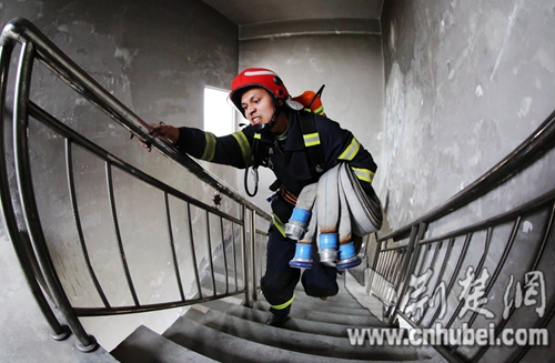 圖為消防官兵開(kāi)展負(fù)重上10樓科目現(xiàn)場(chǎng)。通訊員 朱燕林?jǐn)z